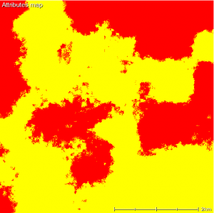 In the above example, the two land types ('red' and 'yellow') have identical parameters (BaseProg/grad/water/etc), but 'red' has non-zero settings for its Perlin1 noise generator. Thus, the difference in distributions of the two land types is determined only by the noise settings. Please note: