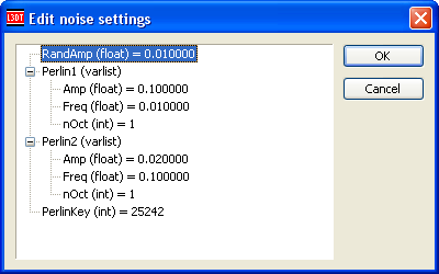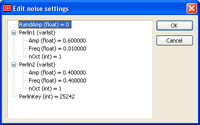 The noise parameters are accessed from the parameters tab of the land type editor dialog, by clicking on the 'Noise…' button. The noise settings dialog box looks a little something like this: The meaning of the various settings are explained below: RandAmpRandAmp is essentially the strength of 'static' random noise (such as you get on an untuned TV set) that effects the score of the land type. If this value is used, it is normally set to a very small value (eg. 0.001).