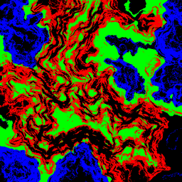 However, using the above 3 alpha map images (and the 9 corresponding ground textures) will strain contemporary GFx cards, particularly if they're rendering other things as well (detail maps / light maps/ bump maps / etc). You can reduce the number of images required by combining the alpha layers of similar land types (see 'Combine alpha layers' wizard). The image below is the combined alpha map in which all grass texture alphas were packed into the green channel, rock is in blue, and sand/mud is in the red channel. Using this alpha map you then only need 4 textures in GFx memory when rendering; one for grass, one for rock, one for sand/mud, and the alpha map itself. The result won't look as good at run-time (since all the grass will look the same), but it will render a whole lot quicker.