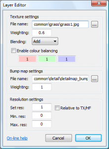 Min. res.The minimum TX/HF resolution2) for which this texture layer will be used. A value of zero or less implies the texture will be used for all TX/HF ratios. Max. res.The maximum TX/HF resolution for which this texture layer will be used (compare with Min. res., above). Relative to TX/HFConsult Set res., above. Except where otherwise noted, content on this wiki is licensed under the following license:CC Attribution-Share Alike 3.0 Unported