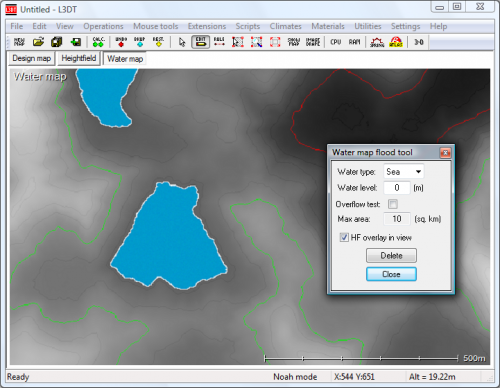 In this window you can set the water type (lake or sea), maximum area of the flood (in square kilometres), and water level / depth. The flood test will start wherever you left-click on the map. If the flood is successful L3DT will report the area of the water body, and if unsuccessful it will explain why. Clicking on the Depth label will switch to Water level and vice-versa (see above images). The difference between the two modes is that the former is the depth of the water at the point of flood, whereas the latter is the absolute altitude for the water surface. To make flooding a little easier to judge, L3DT automatically switches on heightfield / water map mixing to give altitude contrast and also display contour lines, as shown below. You can disable this overlay by un-checking the 'HF overlay in view' check-box.