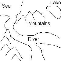 Drape transparent colourYou can nominate one RGB colour in the drape image to be transparent using the Drape transparent colour option. If this option is enabled, wherever the drape image has this colour it will be fully transparent, and show the map beneath it. Map transparent colourYou can also nominate one RGB colour in the map to be transparent using the Map transparent colour option. If this option is enabled, wherever the map has this colour it will be fully obscured by the drape overlay. Removing the overlayTo remove the overlay, click on the Clear overlay button in the Image drape settings window. ExampleOne application of the image drape feature is to help users design maps from topographical images or rough sketches, such as this:
