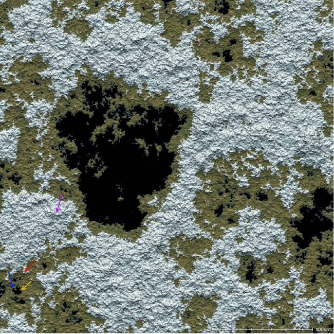 I only really grokked the full scale of the map when I went looking for the same features in the 2D view. Note how the area we've been looking at, from the lakes to those those really distant mountains (purple arrow, > 100km away), is just a small part of the southwestern corner of the map.