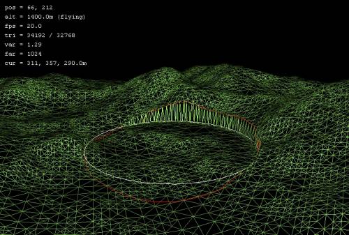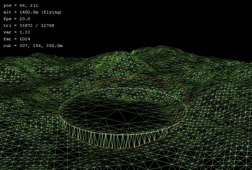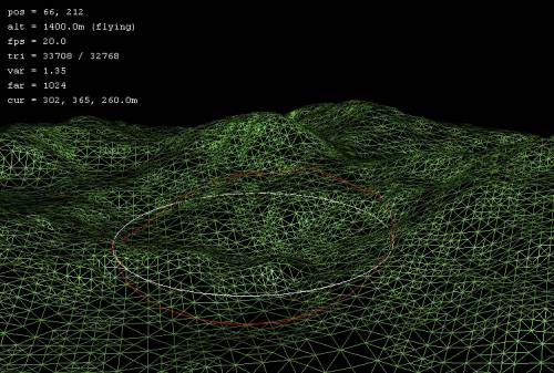 Lower brushThe Lower brush continuously lowers the terrain under the mouse until you release the left mouse button. Set To brushThe Set to brush allows you to set the terrain within the brush radius to a specific altitude. When you select the set to tool, you will be prompted to enter the desired brush height, which is measured in metres above sea level. To help in choosing the correct brush height, the head-up display at the top left of the screen displays the height at the current mouse cursor position and height in the 'cur:' field (e.g. 260m, in example below left). The level of the chosen brush height is displayed by a second circle rendered in white, as shown below. This circle gives the position of the platform that will be created by the set to tool.
