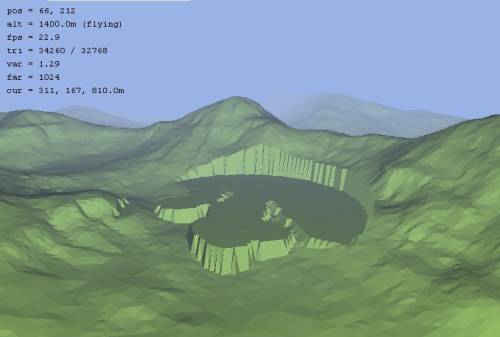 Lower To brushThe Lower to brush is a modification of the set to brush that only sets the terrain within the brush radius to the tool height if it is above the tool height. Note in the below image, the hills to the back-left of the brush have been clipped, while the valley is unaffected: