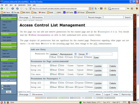 Review of DokuWikiReview by Aaron Torpy DokuWiki is a PHP-based wiki program produced by Andreas Gohr et. al.1), which is freely available for download from http://wiki.splitbrain.org/wiki:dokuwiki. Of all the wiki systems out there, I chose DokuWiki for the L3DT community wiki site because it is simple to install, easy to use, and trouble-free to administer. InstallationIn my experience, the installation procedure for DokuWiki, as outlined in the installation guide, is about as easy as it can get for such software. It was certainly a lot easier than MediaWiki, which I tried to install before DokuWiki on account of it being well known, but that ended in a complete shambles when I tried to integrate it with my phpBB forum, and thus the installation was aborted. Admittedly, MediaWiki is designed to handle huge distributed-architecture wikis like Wikipedia, so it's not too surprising that it's too complex for the mere likes of me. Anyway, the basic DokuWiki installation procedure is to copy the script files to the desired directory on your web-server. You then need to CHMOD2) the access-permissions for some of the directories so that DokuWiki can read and write files as required. If you don't have command-line access to your server, such as the case for most of the cheaper web-hosts, you can do this using an FTP client such as FileZilla (using the file properties option). This can be a little daunting for first-time newbies with little UNIX experience (such as I was), but it's really not all that tricky. You'll get the idea within a minute or two. At this point you should have a functional installation of DokuWiki, but it's probably a good idea to mess around with some settings before 'going live'. The configuration settings are stored in the 'local.php' file in the 'conf' folder (if it doesn't exist, make a copy of the 'local.php.dist' and call it 'local.php'). One setting of particular importance is the 'authentication back-end', which is where DokuWiki stores the user-account database. By default, this is set to 'plain', meaning the info is kept locally on the server in a protected file. If you want to integrate your wiki with some other system like a forum or gallery, you have to pick one of the other back-ends that are available, but code examples are provided in the installation guide, so it's a no-brainer. In my case, where I wanted to bolt the wiki to the MySQL user-database of the forum, which is a phpBB script, I simply had to specify the 'MySQL' back-end and add some of the server settings. These steps were all explained in the phpBB integration guide, so it was hard to go wrong. Anyway, that's about all you need do to install DokuWiki. Painless is the adjective I'd use to describe it. AdministrationAccess Control Lists (ACL)By default, DokuWiki allows full read/write/delete/upload privileges to all visitors. If you're using DokuWiki for a public website, such as this, that can be a little bit generous and a little bit dangerous, as anyone can anonymously upload nasty files or delete pages. However, DokuWiki has a thing called the 'access control list' that allows you to restrict user rights on a global, per-page and per-namespace basis. As we shall see in the admim page discussion, there is a nice interface for setting ACL privileges for each page and namespace. However, to simply prevent non-members from messing with your entire wiki, all you need do is change your 'conf/acl.auth' file to say something like this: * @ALL 1 # read-only * @user 8 # read/edit/create/upload for reg. users These settings mean that all visitors can read all of your pages, but only users (i.e. logged-in members) can read/edit/create or upload. Admin pageI only discovered the admin page recently, as it is only visible to the 'superuser' specified in the 'conf/local.php' file, and I had forgotten to add myself to the list. Anyway, if you are either the user - or a member of the group - that is specified as 'superuser', you will see an 'admin' button at the bottom-right of the page, next to 'logout'. If you click on this button, you go to the admin page, which has nice things like user-account control3), and also the 'access control list' management. This latter option is worth exploring: In the above image you see the ACL management page, which is what I've used to prevent all visitors other than myself from editing this page. Generally you would want to leave most pages with read/write/edit/upload privileges for users and read-only privileges for ALL (meaning non-members), but in some instances there may be pages you want to protect, particularly if you've got a vandalism problem like they do on Wikipedia. Tracking changesBecause content in a wiki is essentially unmoderated, it is important that administrators and page authors have a nice and easy way to track additions and changes. At the top of each page DokuWiki has a button that links to the index of recent changes (see example here), from which you can easily see the differences between page versions (using the blue/red glasses icon). You can also view recent changes in the dokuwiki RSS feed, which is normally found at 'feed.php' in the wiki root directory (I've renamed mine to rss.php for reasons I can't remember). By subscribing to this news-feed in a feed-reader such as FeedReader or Opera (see RSS guide for help), you will be alerted whenever someone creates or changes a page in your wiki. Using DokuWikiFormatting and syntaxOther than some minor vandalism of Wikipedia in my youth, I had never used a wiki before I installed DokuWiki. I was very pleased, therefore, to discover that after mere minutes browsing of the syntax guide I knew all there was to know about formatting text, tables, lists and images in DokuWiki. It's very powerful, but it's also very easy. Let's consider, for a moment, the example of a simple list: