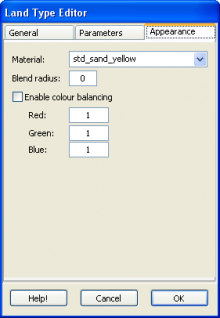 Display colourOn the general tab, set the Display col. to something green. This option is just the colour used to represent this land type in the attributes map display, but it's sensible to pick a colour that's fairly close to the final texture colour. You'll soon see what I mean. Base ScoreOn the parameters tab, set the Base score option to 100. Leave all other settings at their defaults (usually zero). With these settings, your 'grass' type will always get a score of 100% in the land type calculation, irrespective of gradient, water-level, altitude, salinity, etc. For other land types to 'beat' grass, and thereby be assigned to the attributes map (and texture, alphas, etc.), they must score higher than 100%. MaterialOn the appearance tab, we now have to select the right material for this land type. Materials are the objects that determine how a land type will look in the final terrain texture map, and contain settings for bump-map and texture images, and various other settings like blend options, strata layer settings, etc. Anyway, later in this tutorial I'll explain how to generate new materials, but right now we'll just select one of the standard materials: For the grass land type, select the 'std_grass' material. SandName and display colourOkay, let's go back to the climate editor and create another land type, called 'sand'. Before I get carried away with parameters, I'll also set the display colour to something yellow (otherwise it defaults to a hideous magenta colour, so as to remind you to set the colour.) Quick way: Altitude RangeThe quick and nasty way to make a sand-like land type is to set an appropriate altitude range, such as “10m above sea level and below”. This is the way Terragen 1 did it, and it's probably the most intuitive way for new users. Thus I start here. In the parameters pane, set the following values: