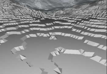 So, users should be mindful that the step artefacts may not be caused by, or fixed by, the final file format or bit depth used to store the height data. Step artefacts in the output could have been introduced at any stage of the generation pipeline. Can the step artefacts be fixed somehow?Since you’re reading this page, it is reasonable to assume that you have some height data that contains step artefacts, and you’d like them removed. As I’ve explained above, simply re-saving the height data in a higher bit depth file like a 16-bit image won’t do any good by itself. What you need to do is somehow filter the data to turn this… …back into this… Some approaches you can take to remove the steps are listed below. Contour interpolationThe ‘ideal’ way to fix steppy height data may be to use some sort of edge detection followed by contour interpolation. Unfortunately, I don’t know of a program that will do this for you. If you do know of such a program, please let us know in this forum thread. SmoothingAn easy approach to removing step artefacts is to apply a smoothing filter to your height data. You can do this in L3DT using the ‘Operations→Heightfield→Smooth’ menu option. However, users should note that to fully remove step artefacts you do have to do rather a lot of smoothing, and this will make your terrain look unnaturally smooth. Smooth is better than stepped, perhaps, but it’s still not ideal. Below I have included before-and-after screenshots to show the effect of smoothing on a heightmap that contains 8-bit step artefacts.