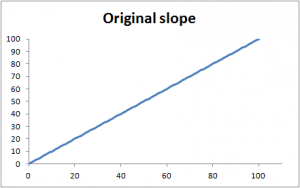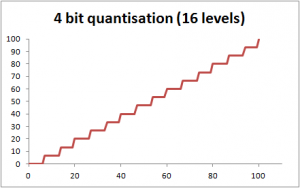What causes these steps?These steps are usually the result of quantisation caused by using low bit-depths to store the height data, such as using 8-bit file formats. I’ll explain more about programs and image formats in a moment, but for now it suffices to say that many programs and file formats store image and heightfield data using 8-bit integers for each pixel. These 8-bit integers can store 28 (or 256) different values, from 0 to 255 in whole-number steps. Integers don’t store fractional values; instead they are truncated to the lower whole-number value (i.e. 12.8 becomes 12). To demonstrate the effect, somewhat exaggerated, I have plotted below a slope showing the steps caused by severe quantisation from a hypothetical 2-bit file format. The ‘raw’ slope is shown in green, and the 2-bit integer slope with steps is shown in red. Two bits can store 4 values (22 = 4), so you see four distinct levels.