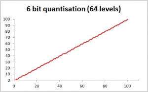 For every extra bit we use to encode the height values, we double the number of possible levels, which increases the number of steps but decreases their height. Below I have plotted the same slope showing the effect of increasing the bit depth from 3 bits (8 levels) to 6 bits (64 levels).