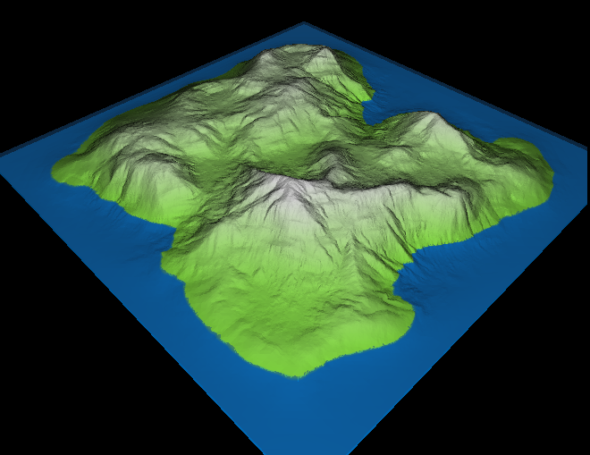 Also, some users may be pleased to note that L3DT Professional is now available as a 64-bit executable. However, the 64 bit version has only been available as a developmental build for a short while, so it hasn't had a huge amount of public testing. My testing has found no new faults so far, so it's probably OK, but your mileage may vary. Please report any bugs you find, and I will fix them ASAP. Please address any feedback or bug reports to this forum thread, or e-mail aaron@bundysoft.com. Lastly, this release includes a new option to flatten the edges of maps, which (amongst other things) can be used to make islands: